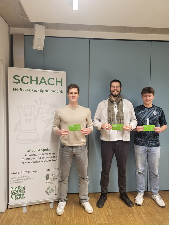 Zum dritten Termin unseres monatlichen Blitzturnieres kamen 12 Kinder und Jugendliche, um beim FIDE gewerteten Rundenturnier um die begehrten GrazGutscheine zu spielen. Es wurde ein Rundenturnier mit 11 Runden und einer Bedenkzeit von 3min+2sek/Zug gespielt. Am Ende hatte Alexander Seitz die Nase vorn. Er erreichte starke 10,5/11 Punkte und darf sich über GrazGutscheine im Wert von 60€ freuen. Simon Grünwald (am Foto durch seinen Bruder vertreten) folgte knapp dahinter mit 10 Punkten auf Platz...